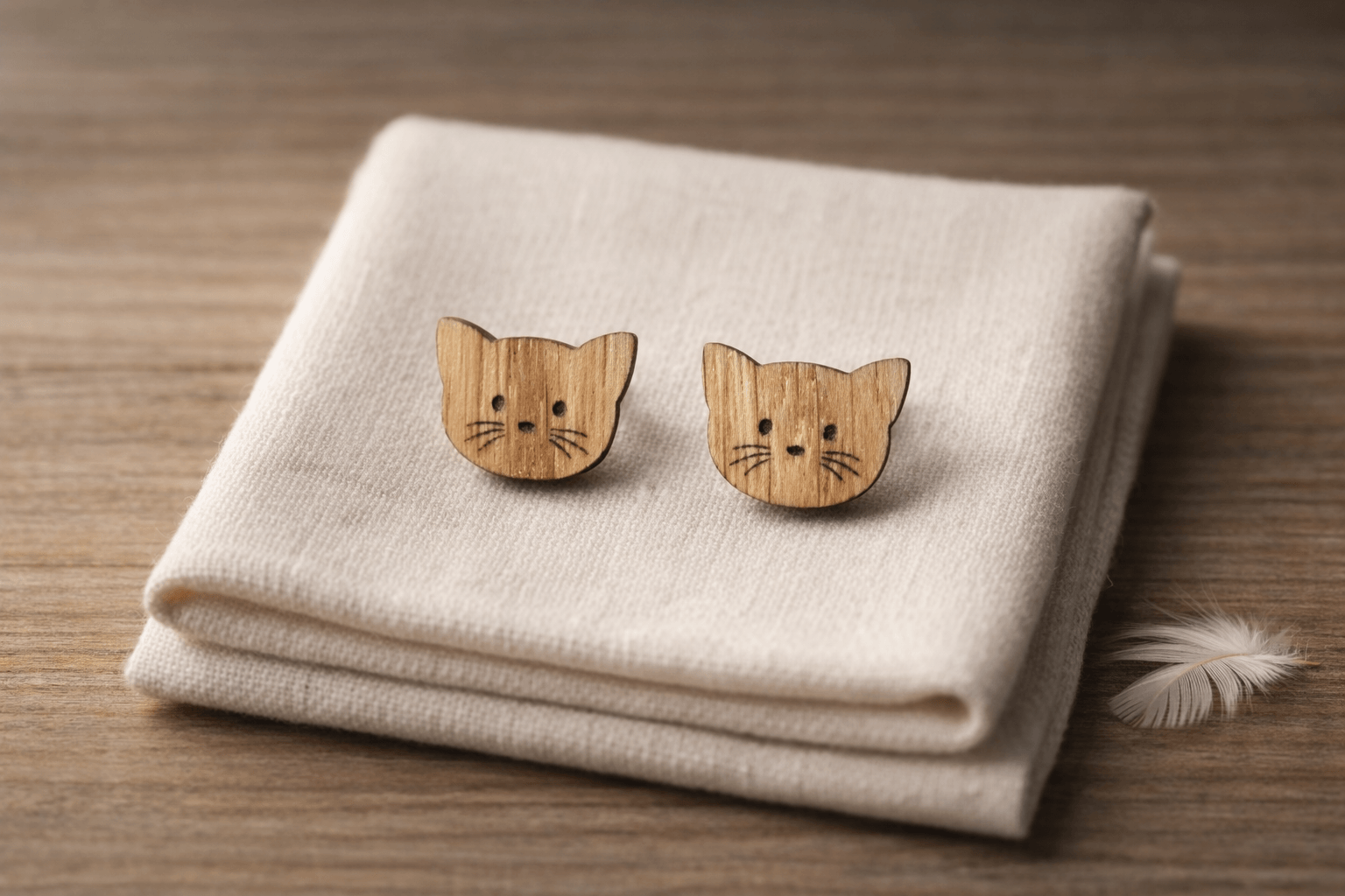 Sztyfty ze stali hipoalergicznej ze wzorem kocich główek grawerowanych laserowo na drewnie dębowym. Drewno zaimpregnowane naturalnym olejem podkreślającym jego unikatową strukturę. Rozmiar główki to ok 1cm