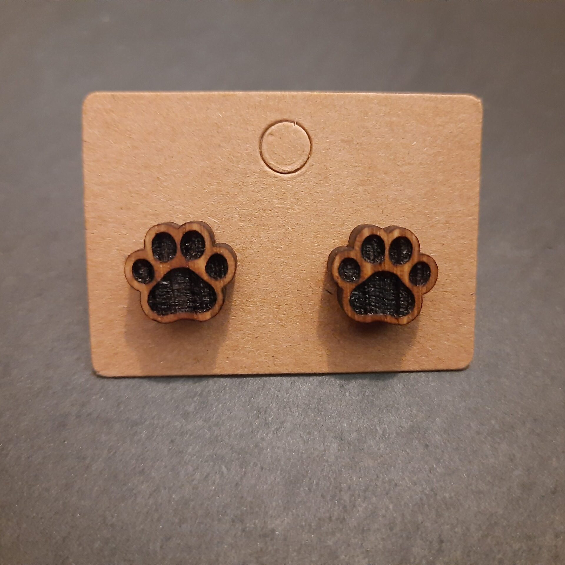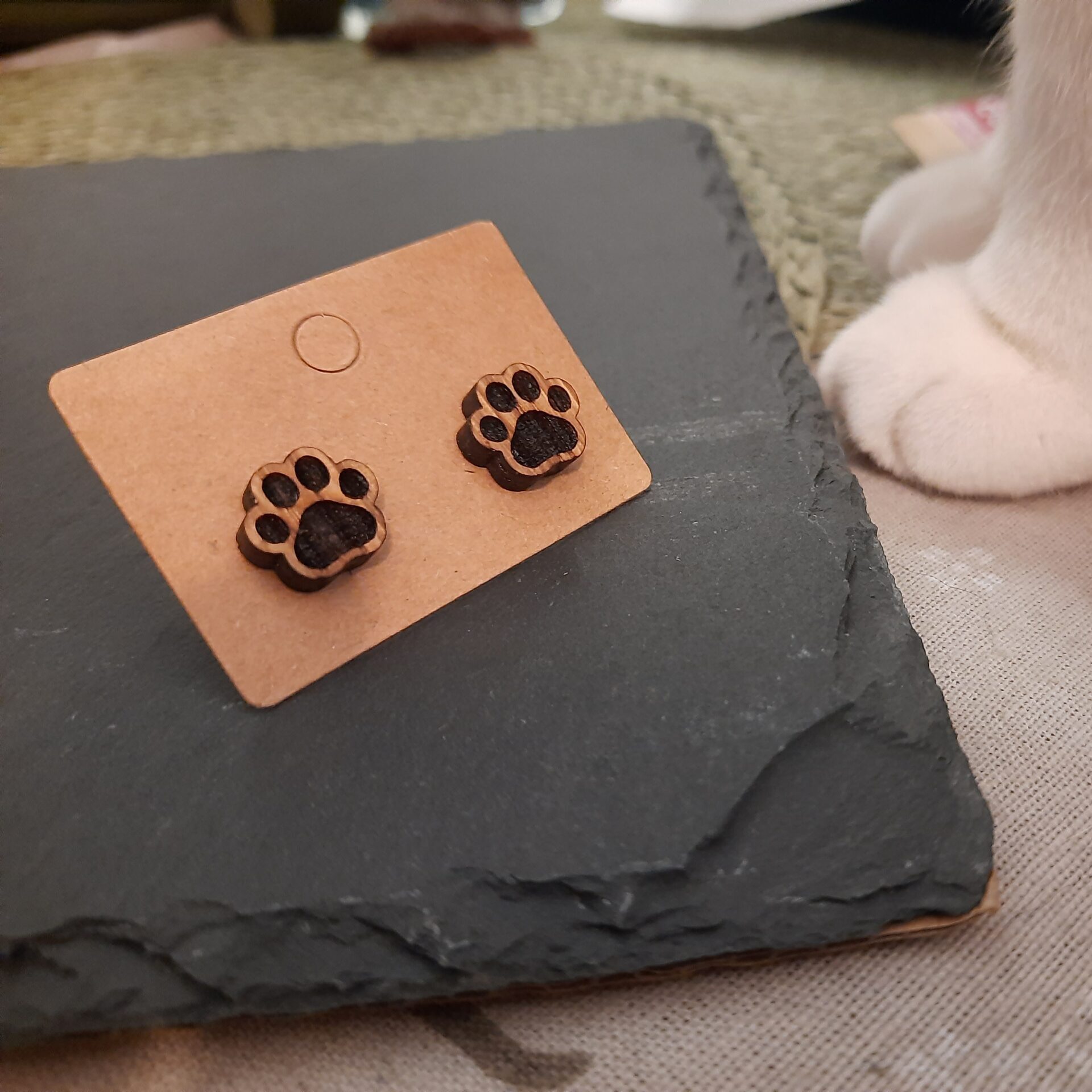 Sztyfty ze stali hipoalergicznej ze wzorem kocich łapek grawerowanych laserowo na drewnie dębowym. Drewno zaimpregnowane naturalnym olejem podkreślającym jego unikatową strukturę. Rozmiar łapki to ok 1cm