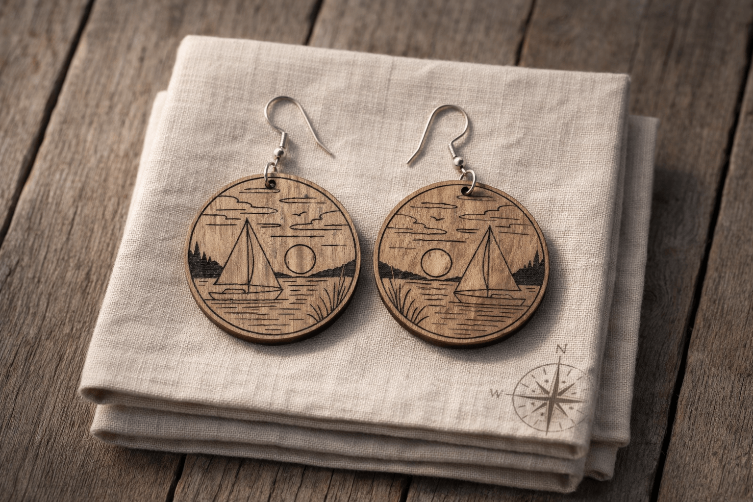 Kolczyki wiszące Jezioro to kolczyki w formie koła przedstawiające spokojny pejzaż jeziora, po którym płynie żaglówka. Nieodłączny element letniej stylizacji dla fanek spędzania czasu nad wodą lub pod żaglami. Wykonane z drewna dębowego i bigli ze stali hipoalergicznej.